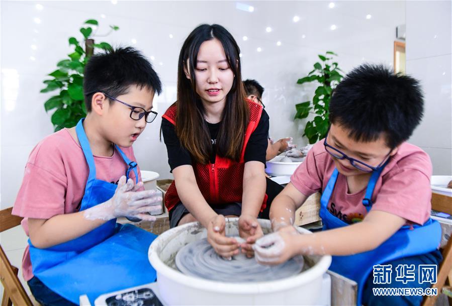 5月25日,小学生们在志愿者指导下制作陶艺作品。新华社记者 徐昱 摄