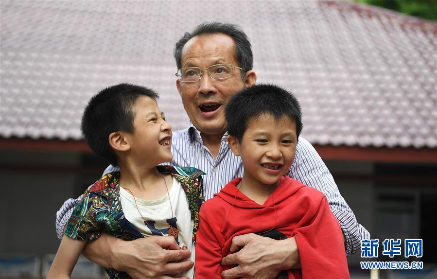 “校长爷爷”黄梅生(中)在和双胞胎哥俩玩耍(5月15日摄)。 新华社记者 万象 摄