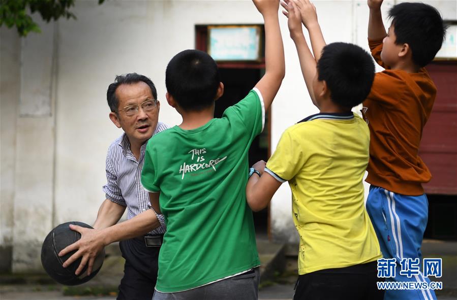 黄梅生(左一)在陪孩子一起打篮球(5月15日摄)。 新华社记者 万象 摄