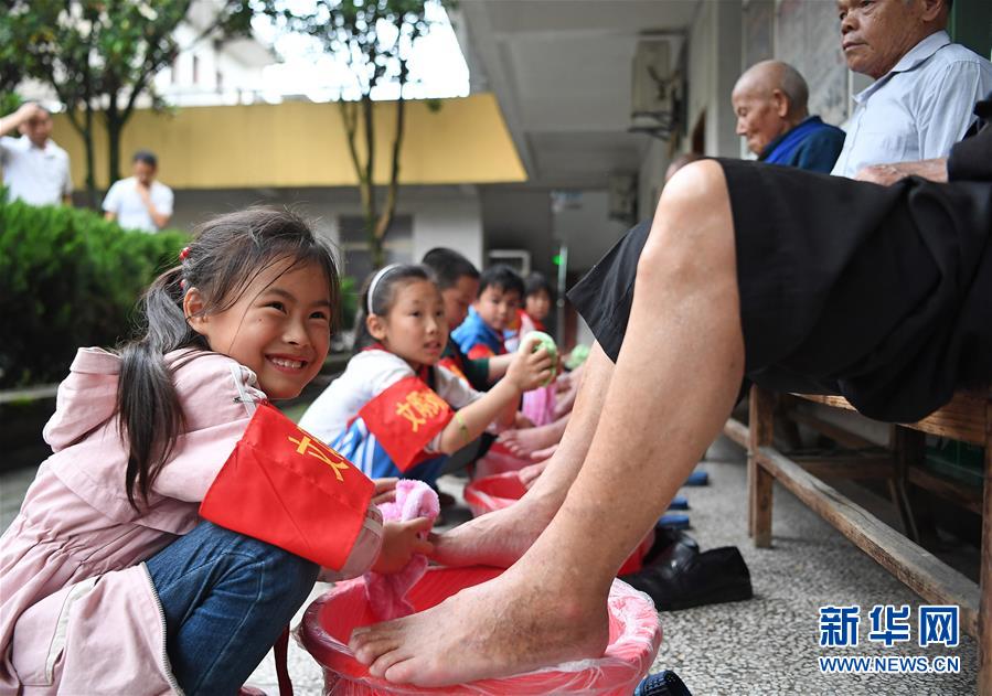 孩子们在黄梅生的带领下,到当地的福利院给孤寡老人洗脚,做“娃娃志愿者”(5月16日摄)。 新华社记者 万象 摄