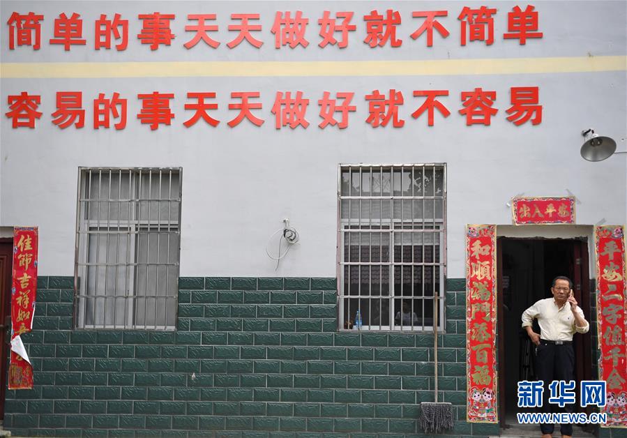 黄梅生在办公室门口与爱心企业联系德仁苑的资助事宜(5月16日摄)。 新华社记者 万象 摄