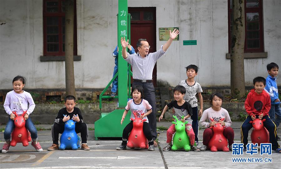 在德仁苑的操场上,“校长爷爷”黄梅生(中)带领孩子们做“跳跳马”的游戏(5月15日摄)。 新华社记者 万象 摄