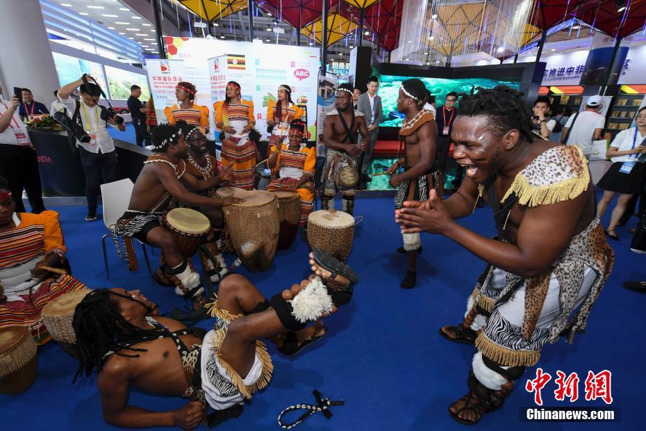 6月27日,来自乌干达的舞者在展厅内载歌载舞。当日,第一届中国-非洲经贸博览会在湖南省长沙市举行。 中新社记者 杨华峰 摄