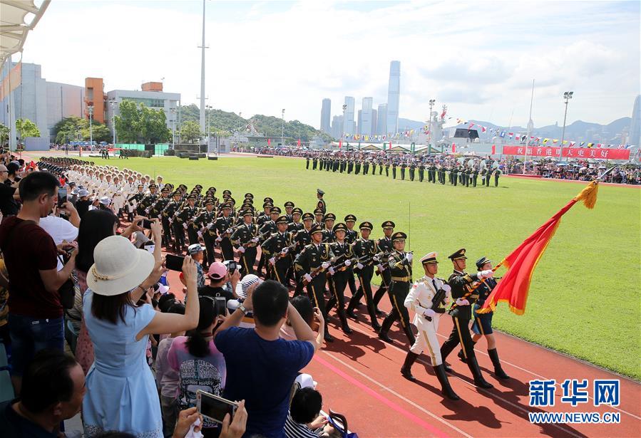 6月30日,解放军驻港部队三军仪仗队在昂船洲军营进行分列式表演 。新华社发(易定 摄)
