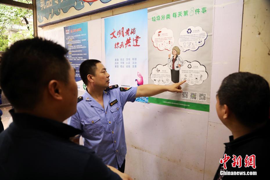 执法人员在指导民众做好垃圾分类。汤彦俊 摄