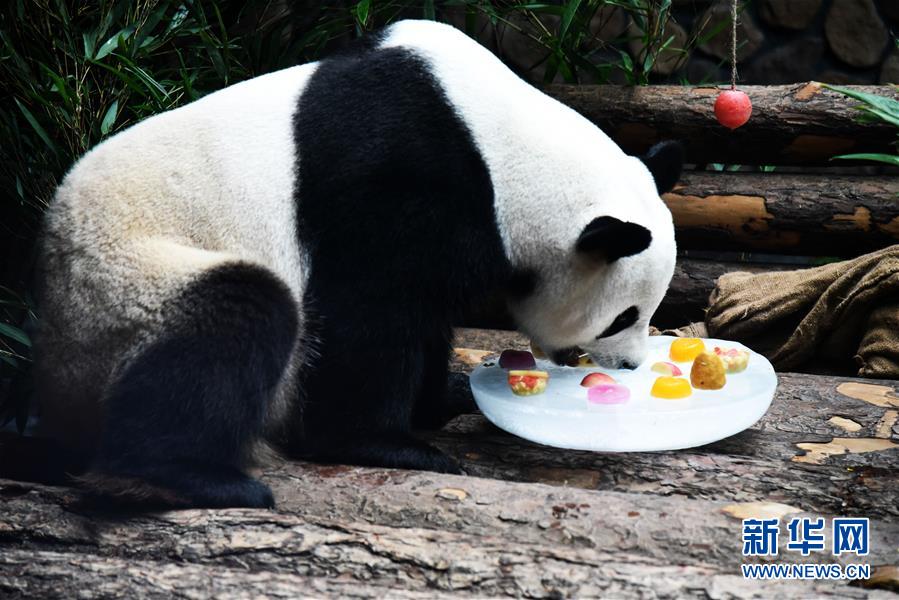 7月15日,济南野生动物世界的大熊猫“二喜”在享用园区工作人员为它准备的包裹着冰块的水果。 新华社记者 王凯 摄