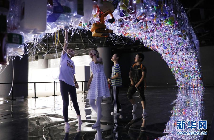 7月14日,观众在参观由回收塑料制品组成的装置艺术作品“巨环”。新华社记者 方喆 摄