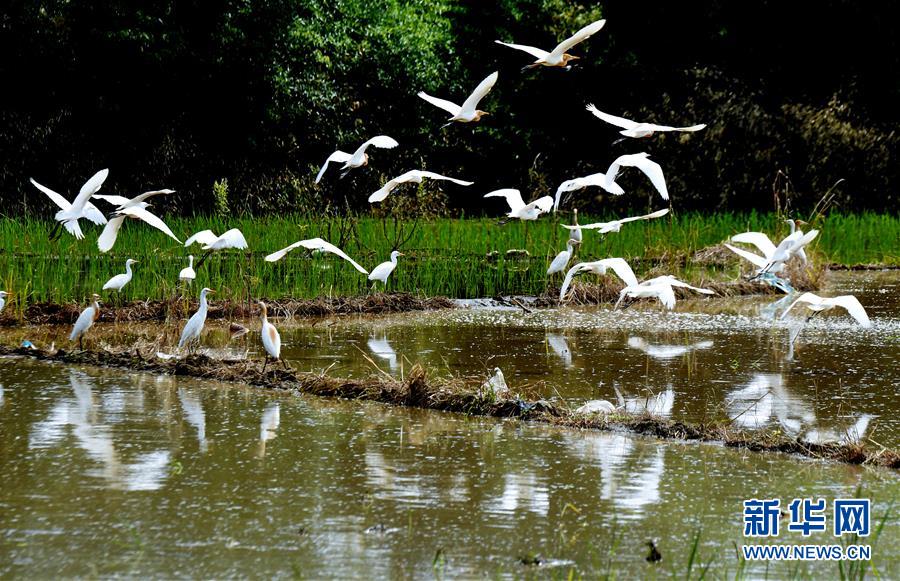 7月19日,白鹭在武夷山市兴田镇西郊村农田嬉戏。 当日,在福建省武夷山市兴田镇西郊村农田,数百只白鹭飞翔在耕田农民周围,绘成一幅人鸟和谐共处的美丽画卷。 新华社记者 张国俊 摄