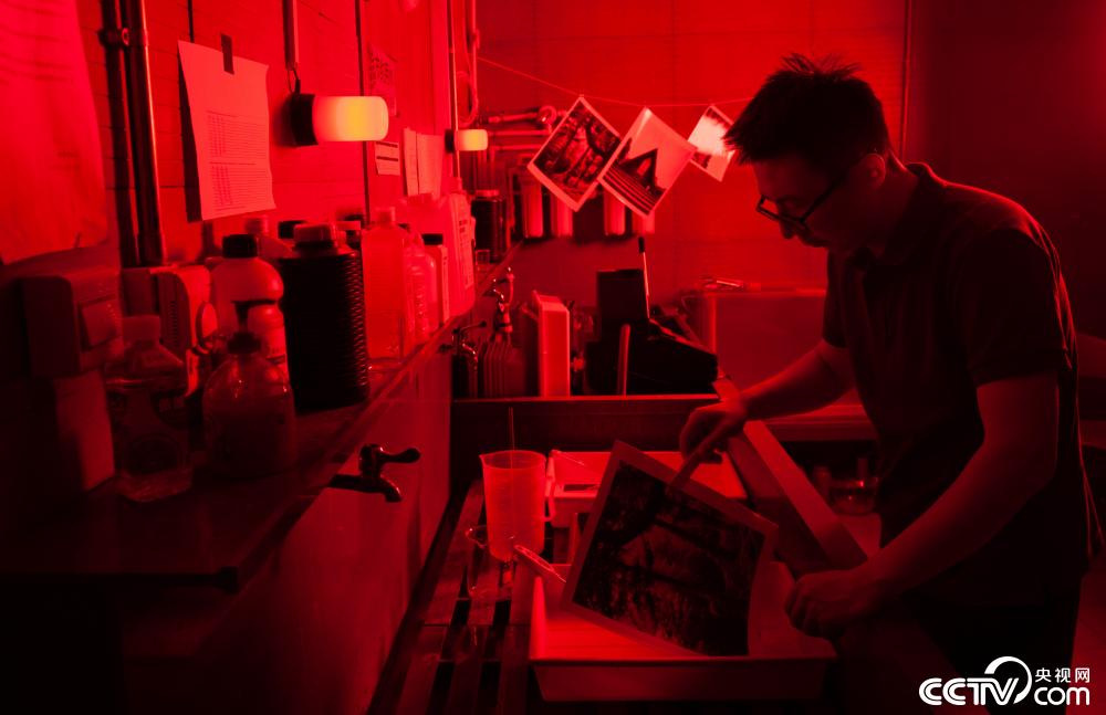 在传统暗房中,刘祺在手工冲洗制作照片。