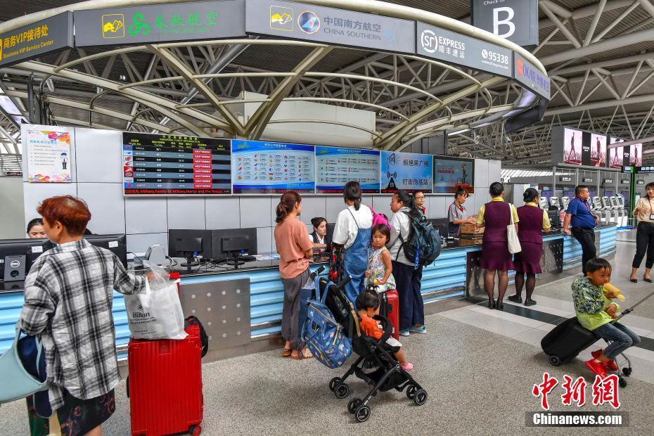8月29日,受台风“杨柳”影响,三亚凤凰国际机场取消航班223架次(进港132架次,出港93架次),目前该机场暂无航班起降,所有飞机均已离场。图为在三亚凤凰国际机场服务台改签航班的旅客。中新社记者 骆云飞 摄