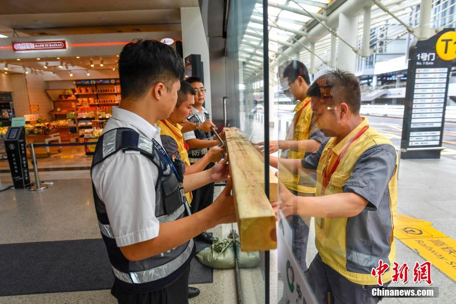 8月29日,受台风“杨柳”影响,三亚凤凰国际机场取消航班223架次(进港132架次,出港93架次),目前该机场暂无航班起降,所有飞机均已离场。图为三亚凤凰国际机场的工作人员正在加固玻璃门。中新社记者 骆云飞 摄