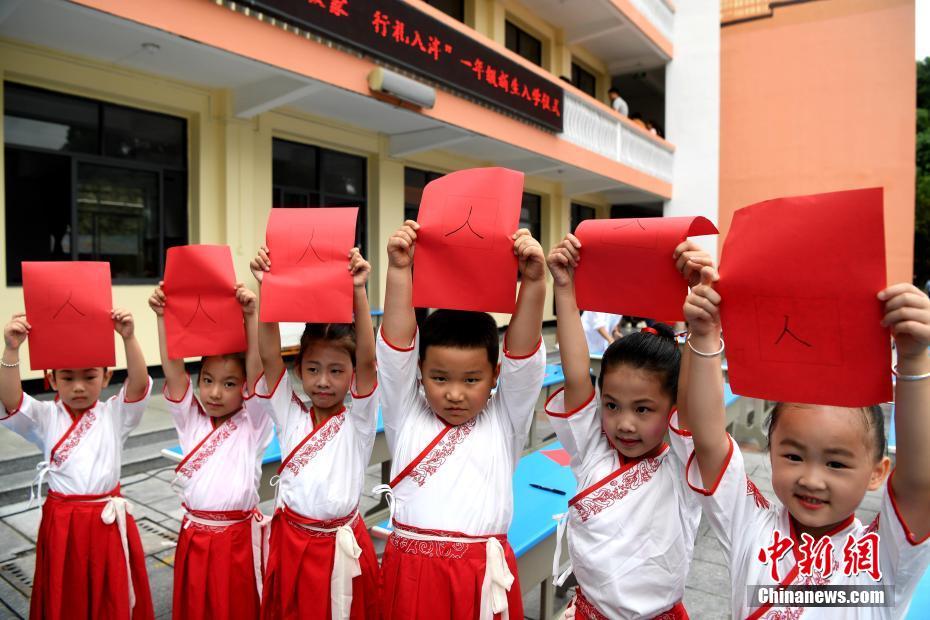 9月2日,福建省沙县城关第三小学举行以“开笔破蒙 行礼入泮”为主题的一年级新生入学仪式。身着汉服的学童们先后进行“正衣冠”“行拜师礼”“净手净心”“开笔破蒙”等仪式,零距离感受中华传统文化。图为一年级新生展示自己开笔破蒙写的人字。中新社记者 张斌 摄