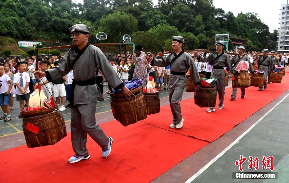 9月2日,福建省沙县城关第三小学举行以“开笔破蒙 行礼入泮”为主题的一年级新生入学仪式。身着汉服的学童们先后进行“正衣冠”“行拜师礼”“净手净心”“开笔破蒙”等仪式,感受中华传统文化魅力。图为老师们身穿古装挑着为学生准备的礼物入场。中新社记者 张斌 摄