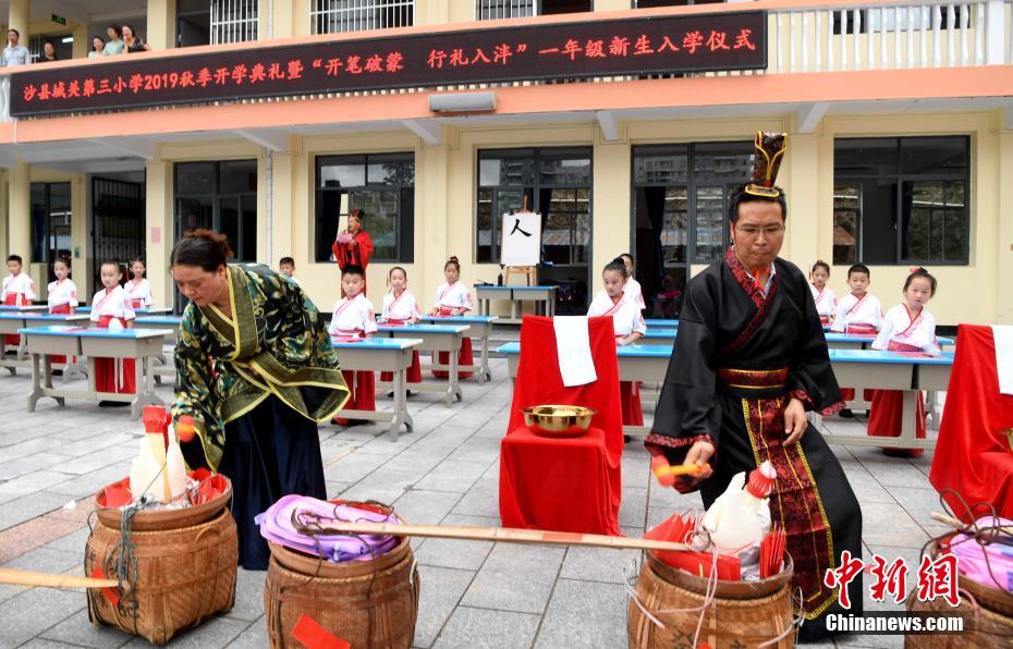 9月2日,福建省沙县城关第三小学举行以“开笔破蒙 行礼入泮”为主题的一年级新生入学仪式。身着汉服的学童们先后进行“正衣冠”“行拜师礼”“净手净心”“开笔破蒙”等仪式,零距离感受中华传统文化。图为穿着古装的老师在进行碎糖仪式,祝孩子们吉祥好运。中新社记者 张斌 摄