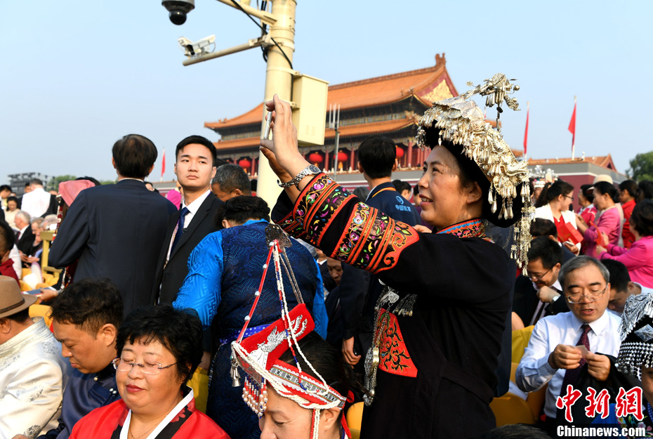 10月1日上午,庆祝中华人民共和国成立70周年大会将在北京天安门广场隆重举行。图为少数民族代表在观礼台上。中新社记者 王东明 摄
