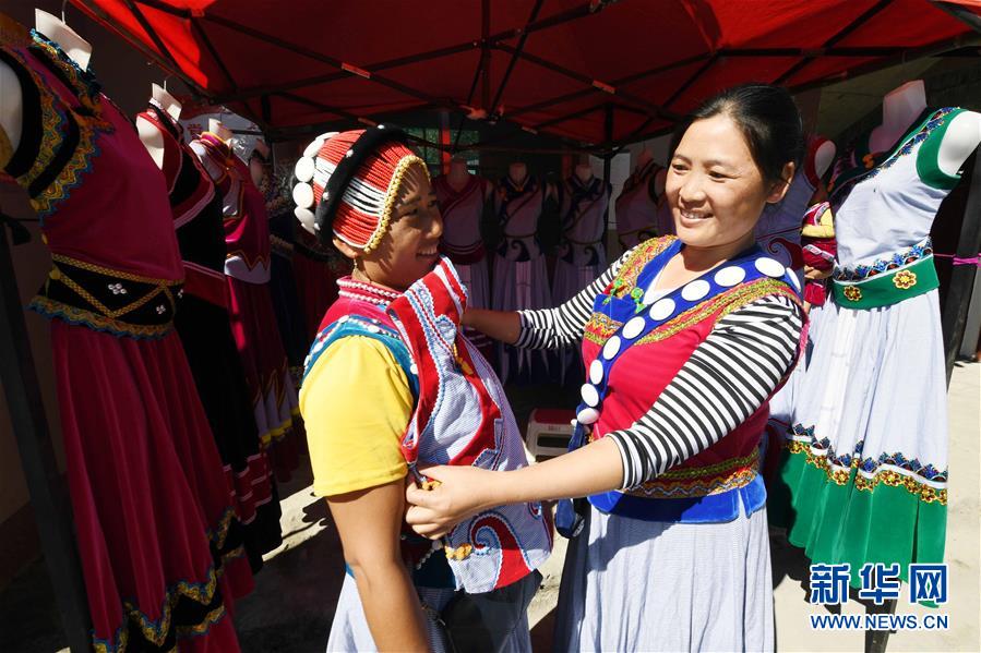 11月2日,云南福贡县鹿马登乡干布村的傈僳族妇女阿白(右)在展示自己手工制作的服饰。阿白靠传统服饰制作每年可收入三万多元。新华社记者 杨宗友 摄