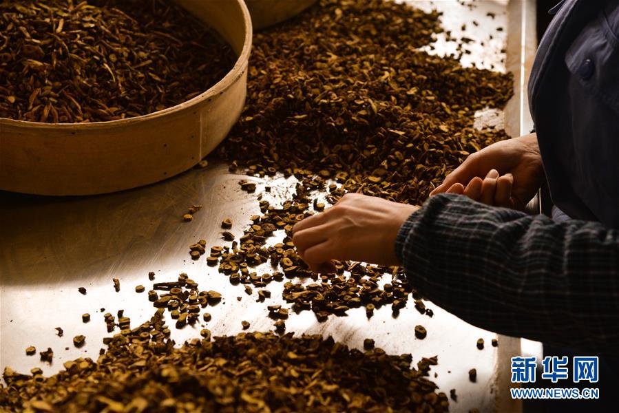 11月23日,工人在牛家营子镇的一家药业公司车间内挑选黄芩。 位于内蒙古赤峰市喀喇沁旗的牛家营子镇是全国重要的中药材产销基地之一。近年来,在当地政府的推动下,牛家营子镇积极建设就业扶贫车间,充分发挥合作社作用,促进中药材产业不断发展。目前,该镇种植北沙参、桔梗等药材面积达7万亩,辐射带动周边地区种植药材25万亩以上。 新华社记者 徐钦 摄