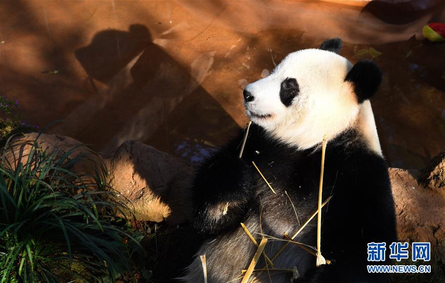 12月7日,大熊猫“贡贡”在室外进食。 海南热带野生动植物园内的大熊猫“贡贡”和“舜舜”走出空调房觅食玩耍,享受冬日阳光。据海南热带野生动植物园工作人员介绍,“贡贡”和“舜舜”在天气渐凉后便喜欢走出空调房,一般一天在室外活动6到7个小时。 新华社记者 杨冠宇 摄