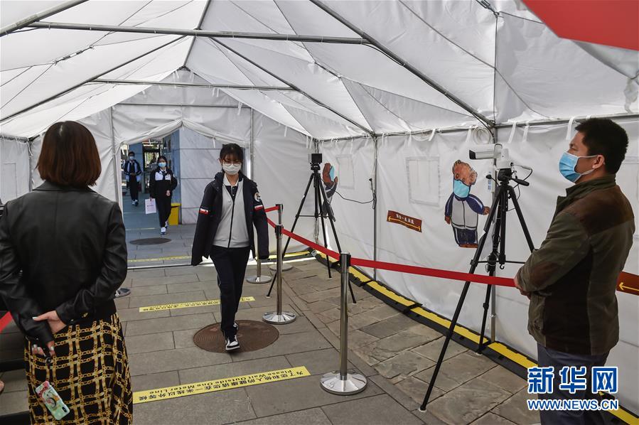 5月11日,北京市第一六六中学的学生通过测温棚。 当日,北京市初三年级学生开学复课。 新华社记者 彭子洋 摄