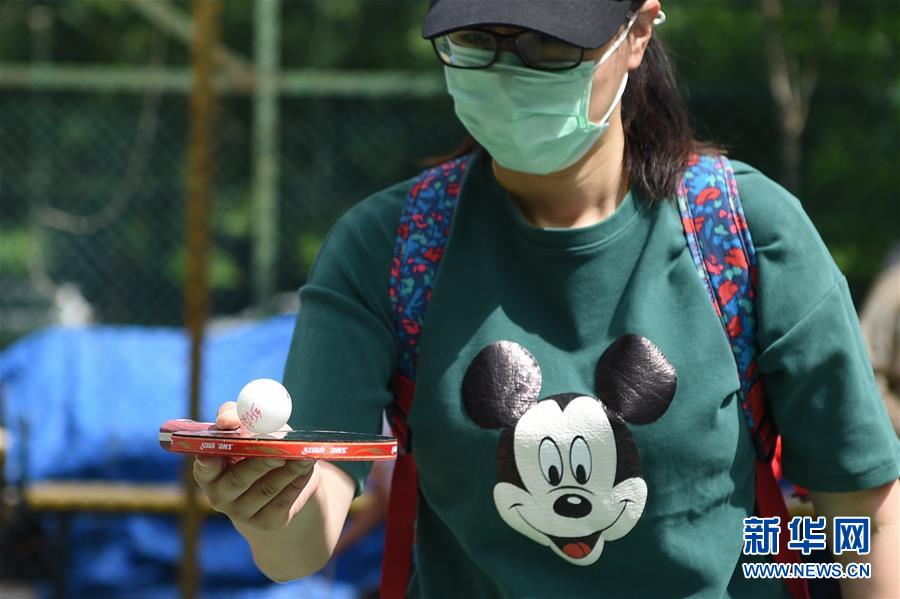 5月23日,一位居民在参与“垃圾分类我接力”的趣味游戏,将代表不同垃圾的乒乓球放入对应的垃圾桶内。新华社记者鞠焕宗摄
