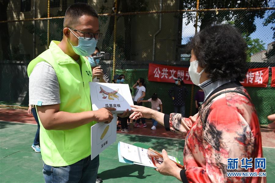 5月23日,一位社区居民(右)在游戏中进行垃圾分类知识问答。新华社记者鞠焕宗摄