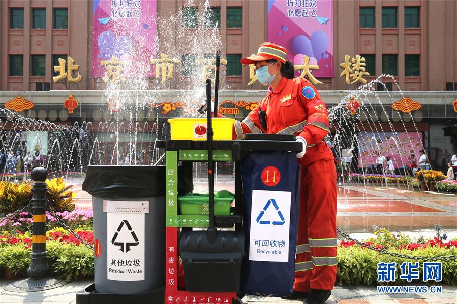 5月29日,环卫工人在北京王府井步行街使用移动垃圾分类保洁车进行保洁作业。 新华社发(郭俊锋 摄)