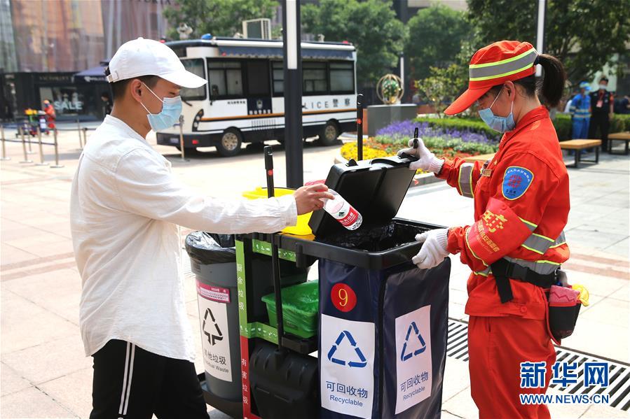 5月29日,在北京王府井步行街,一名行人向移动垃圾分类保洁车中投放垃圾。新华社发(郭俊锋 摄)