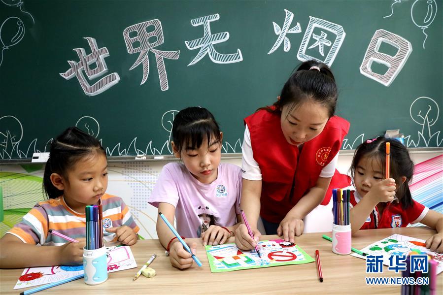 5月30日,在石家庄市桥西区振头街道盛世御城社区,工作人员指导小朋友绘制无烟日宣传画。 世界无烟日来临之际,河北省石家庄市桥西区振头街道以“我是禁烟小卫士”为主题开展活动,孩子们通过制作禁烟标志口罩、禁烟手抄报等活动,了解烟草对人体的危害,争做禁烟小卫士。 新华社记者 王晓 摄