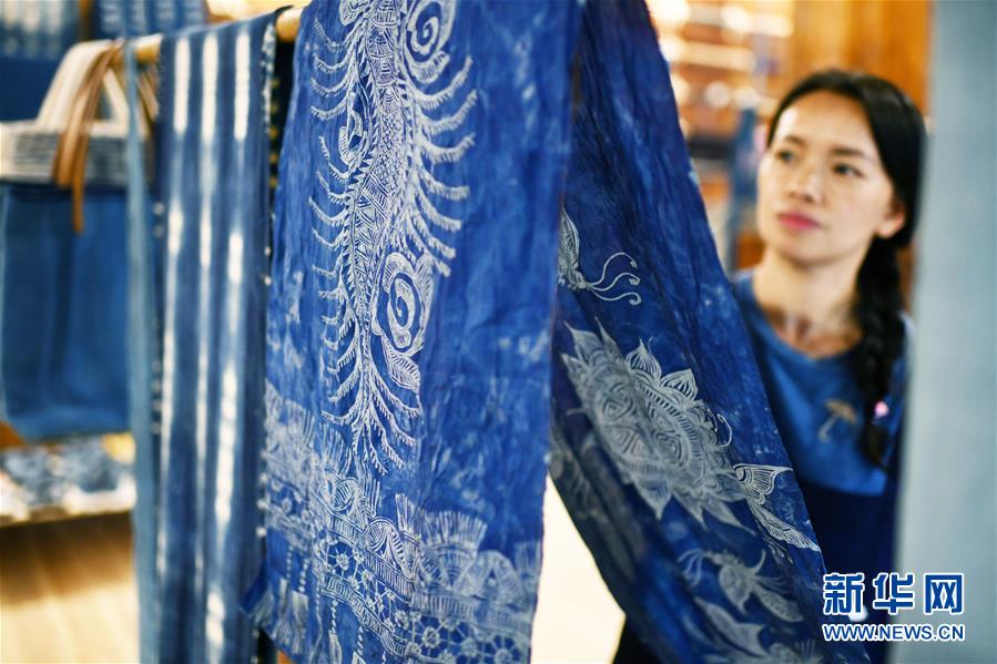 2018年,杨成兰在村里成立传统织染合作社,吸引村里及周边村寨贫困户入股,带动当地贫困户和村民加入合作社,从事织布、染布、蓝靛种植等产业,在传承民族传统手工技艺的同时,帮助村民脱贫增收。 新华社记者 杨文斌 摄