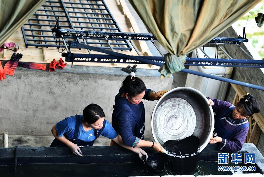 2018年,杨成兰在村里成立传统织染合作社,吸引村里及周边村寨贫困户入股,带动当地贫困户和村民加入合作社,从事织布、染布、蓝靛种植等产业,在传承民族传统手工技艺的同时,帮助村民脱贫增收。 新华社记者 杨文斌 摄