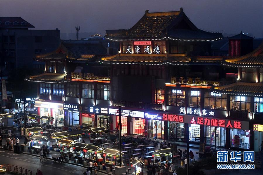这是6月2日拍摄的河南省开封市鼓楼夜市。 近日,河南省开封市鼓楼夜市在关闭4个月后恢复开放。近200个摊位整齐排开,各色小吃琳琅满目,烹炒的火苗、蒸腾的热气、不绝于耳的叫卖声……古色古香的广场上重现欢腾的烟火气。 新华社记者 李安 摄
