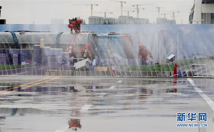 6月3日,救援人员在演练中使用水幕阻挡危化品扩散。新华社记者 方喆 摄