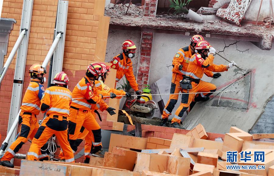 6月3日,救援人员在演练中对倒塌墙体进行破拆。新华社记者 方喆 摄