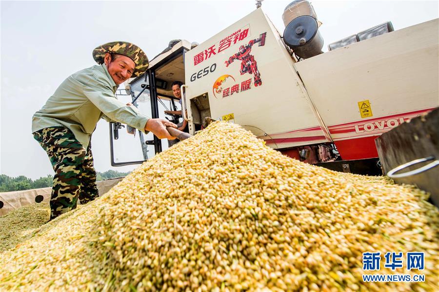 6月5日,山东省青州市邵庄镇朱王孔村农民在收获小麦。 当日是芒种节气,我国各小麦产区的麦收工作正在紧张进行,人们在田间地头忙碌,确保颗粒归仓。 新华社发(王继林 摄)