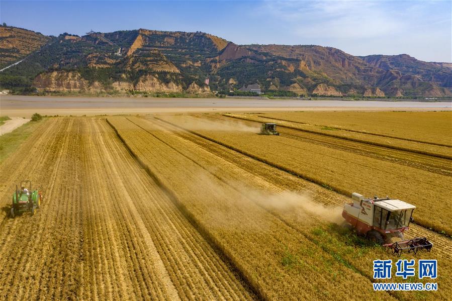 6月5日,在黄河岸边的河南省三门峡市灵宝项生农业机械服务专业合作社的小麦田中,收割机在收获小麦(无人机照片)。 当日是芒种节气,我国各小麦产区的麦收工作正在紧张进行,人们在田间地头忙碌,确保颗粒归仓。 新华社发(杜杰 摄)