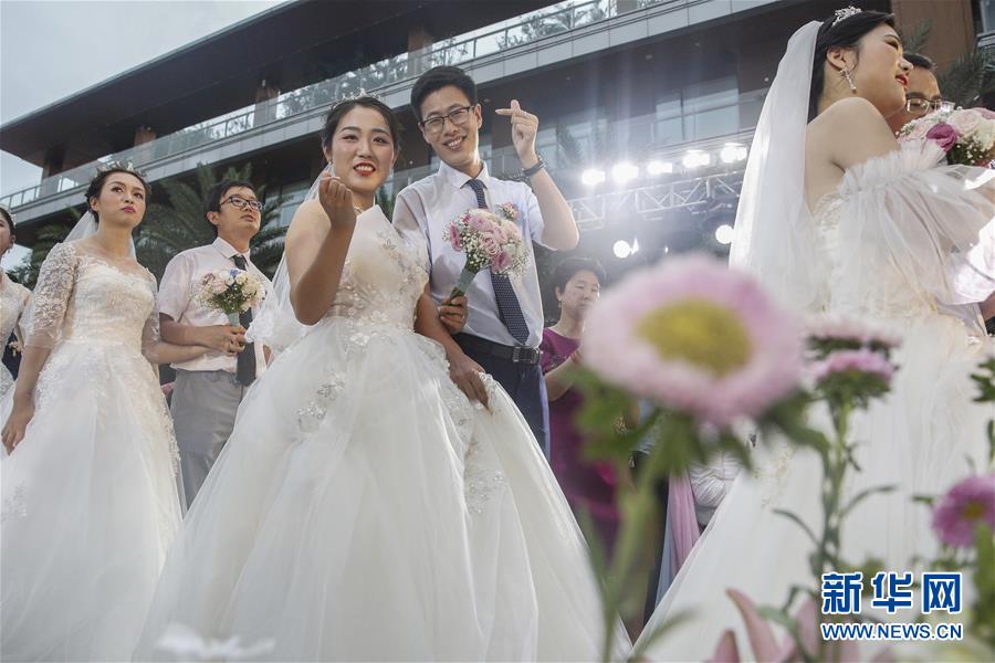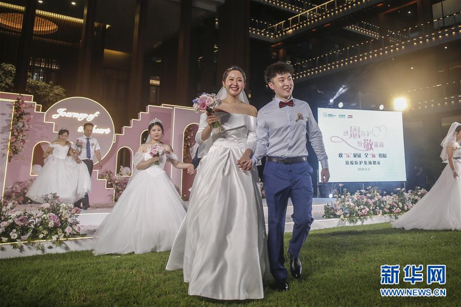 6月6日,新人在海南博鳌乐城国际医疗旅游先行区参加集体婚礼。 当日,来自北京、武汉、广州等地的30对新人在海南博鳌乐城国际医疗旅游先行区参加了一场集体婚礼。参加婚礼的部分新人此前因参加湖北的抗疫工作而推迟了婚期。 新华社记者 张玉薇 摄
