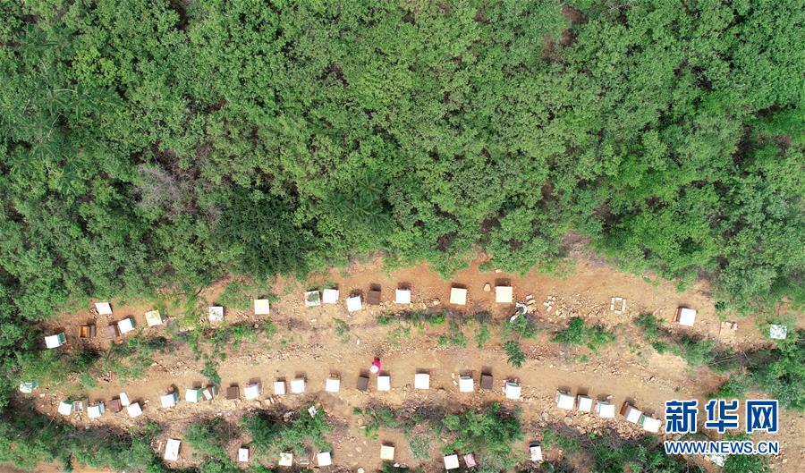 这是6月12日在石家庄市赞皇县许亭乡拍摄的蜜蜂养殖场(无人机照片) 。 近年来,河北省石家庄市赞皇县依托太行山地区丰富的山场林地资源,以贫困户脱贫增收为目标,着力推广蜜蜂养殖产业,通过“公司+合作社+蜂农”的发展模式,当地把分散的蜂农联合起来,进行蜜蜂养殖技术培训,形成集养殖、生产、销售、旅游观光为一体的产业链。截至目前,赞皇县养蜂农户达2000余户,养殖基地遍布全县11个乡镇。 新华社发(梁子栋 摄)