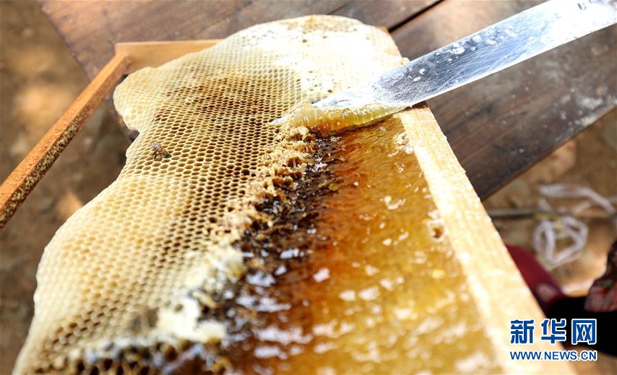 6月12日,在石家庄市赞皇县许亭乡,蜂农在割蜜。 近年来,河北省石家庄市赞皇县依托太行山地区丰富的山场林地资源,以贫困户脱贫增收为目标,着力推广蜜蜂养殖产业,通过“公司+合作社+蜂农”的发展模式,当地把分散的蜂农联合起来,进行蜜蜂养殖技术培训,形成集养殖、生产、销售、旅游观光为一体的产业链。截至目前,赞皇县养蜂农户达2000余户,养殖基地遍布全县11个乡镇。 新华社发(梁子栋 摄)