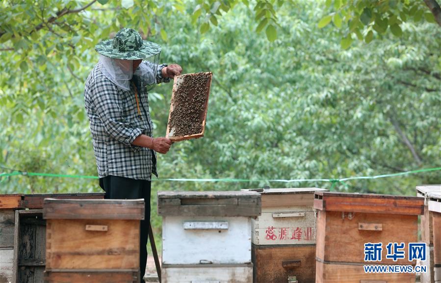 6月12日,在石家庄市赞皇县许亭乡,蜂农在检查蜜蜂饲养情况。 近年来,河北省石家庄市赞皇县依托太行山地区丰富的山场林地资源,以贫困户脱贫增收为目标,着力推广蜜蜂养殖产业,通过“公司+合作社+蜂农”的发展模式,当地把分散的蜂农联合起来,进行蜜蜂养殖技术培训,形成集养殖、生产、销售、旅游观光为一体的产业链。截至目前,赞皇县养蜂农户达2000余户,养殖基地遍布全县11个乡镇。 新华社发(梁子栋 摄)
