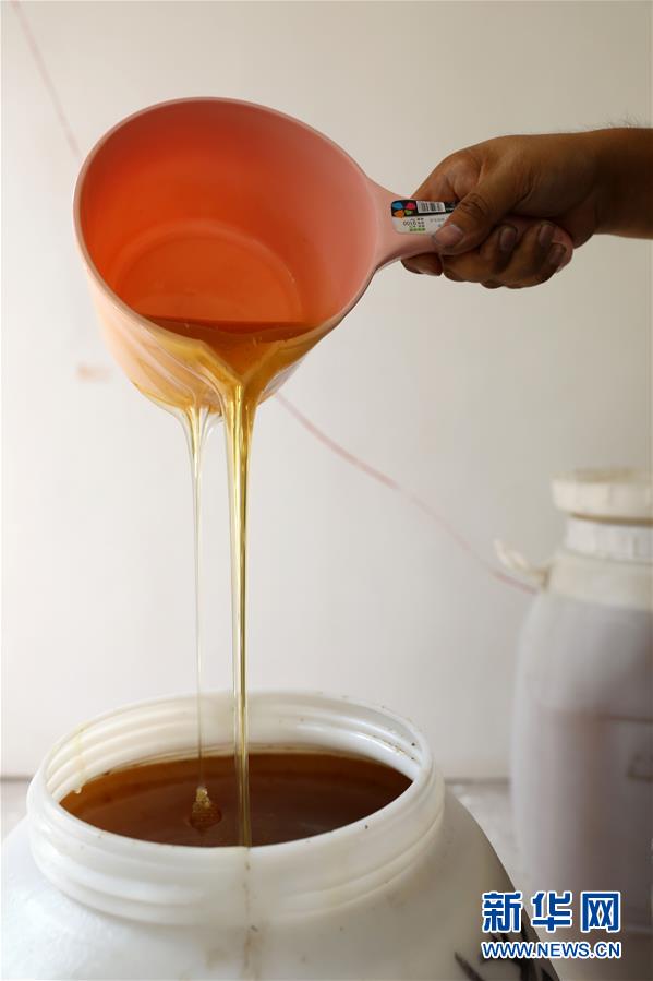 6月12日,在石家庄市赞皇县许亭乡,蜂农在罐装新鲜蜂蜜。 近年来,河北省石家庄市赞皇县依托太行山地区丰富的山场林地资源,以贫困户脱贫增收为目标,着力推广蜜蜂养殖产业,通过“公司+合作社+蜂农”的发展模式,当地把分散的蜂农联合起来,进行蜜蜂养殖技术培训,形成集养殖、生产、销售、旅游观光为一体的产业链。截至目前,赞皇县养蜂农户达2000余户,养殖基地遍布全县11个乡镇。 新华社发(梁子栋 摄)