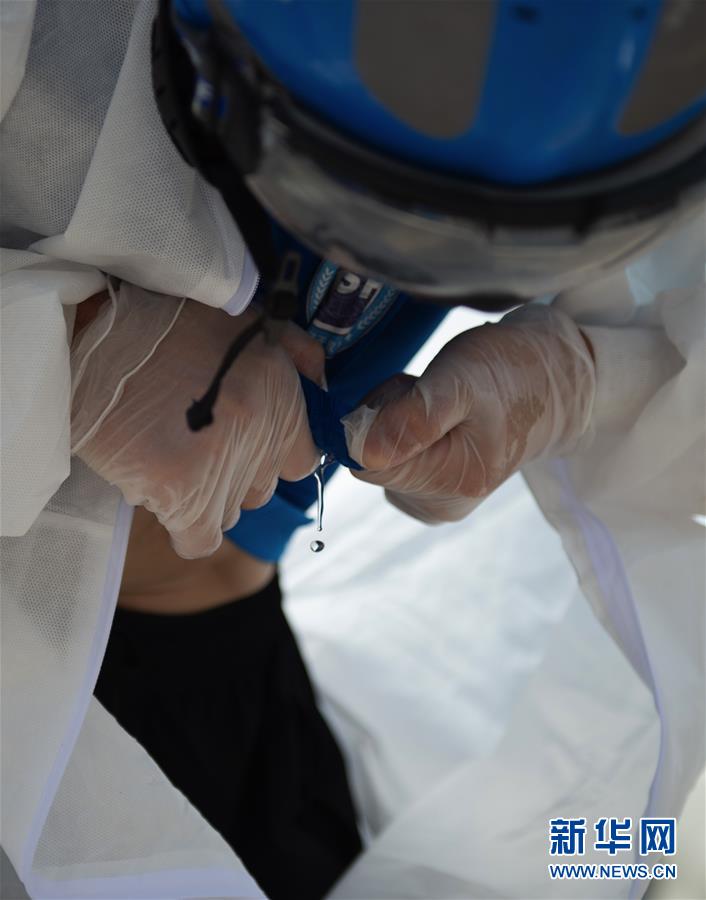 6月16日,北京蓝天救援队完成消杀任务后,一位队员的衣服被拧出了汗水。 连日来,北京出现高温天气。酷暑中,工作人员坚守抗击疫情一线,成为烈日下的“逆行者”。 新华社发(陈钟昊摄)