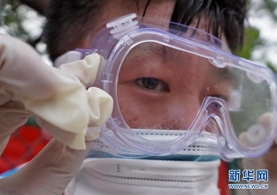 丰台区东高地街道社区卫生服务中心一位医护人员的护目镜内流进了汗水(6月15日摄)。 连日来,北京出现高温天气。酷暑中,工作人员坚守抗击疫情一线,成为烈日下的“逆行者”。 新华社记者 李欣 摄