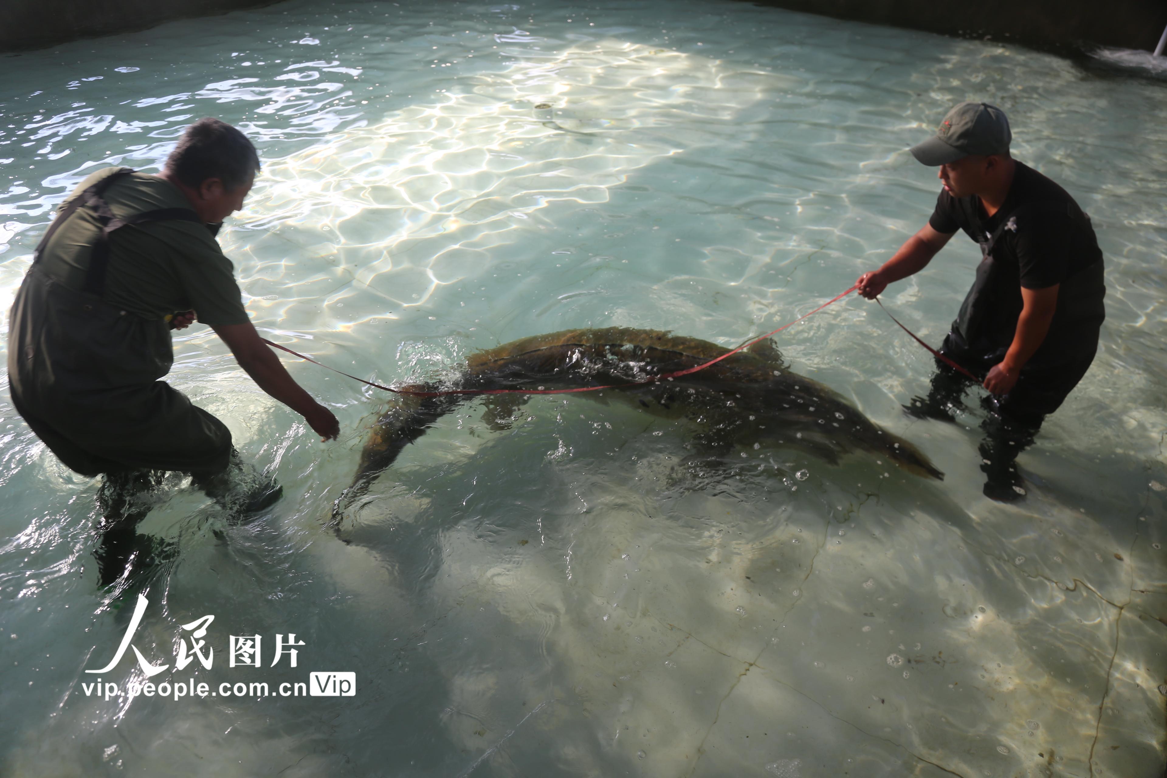 据了解,这位特殊的来客是一条野生雌性长290厘米、体重约300斤的达氏鳇,年龄在60至70岁。达氏鳇俗称鳇鱼,是淡水鱼类中体形最大的一种,也是全世界唯有黑龙江流域才有的珍贵鱼种,是白垩纪时期保存下来的古生物群之一,具有“水中熊猫”的美称,为国家二级野生保护动物。人民图片/张辉 摄
