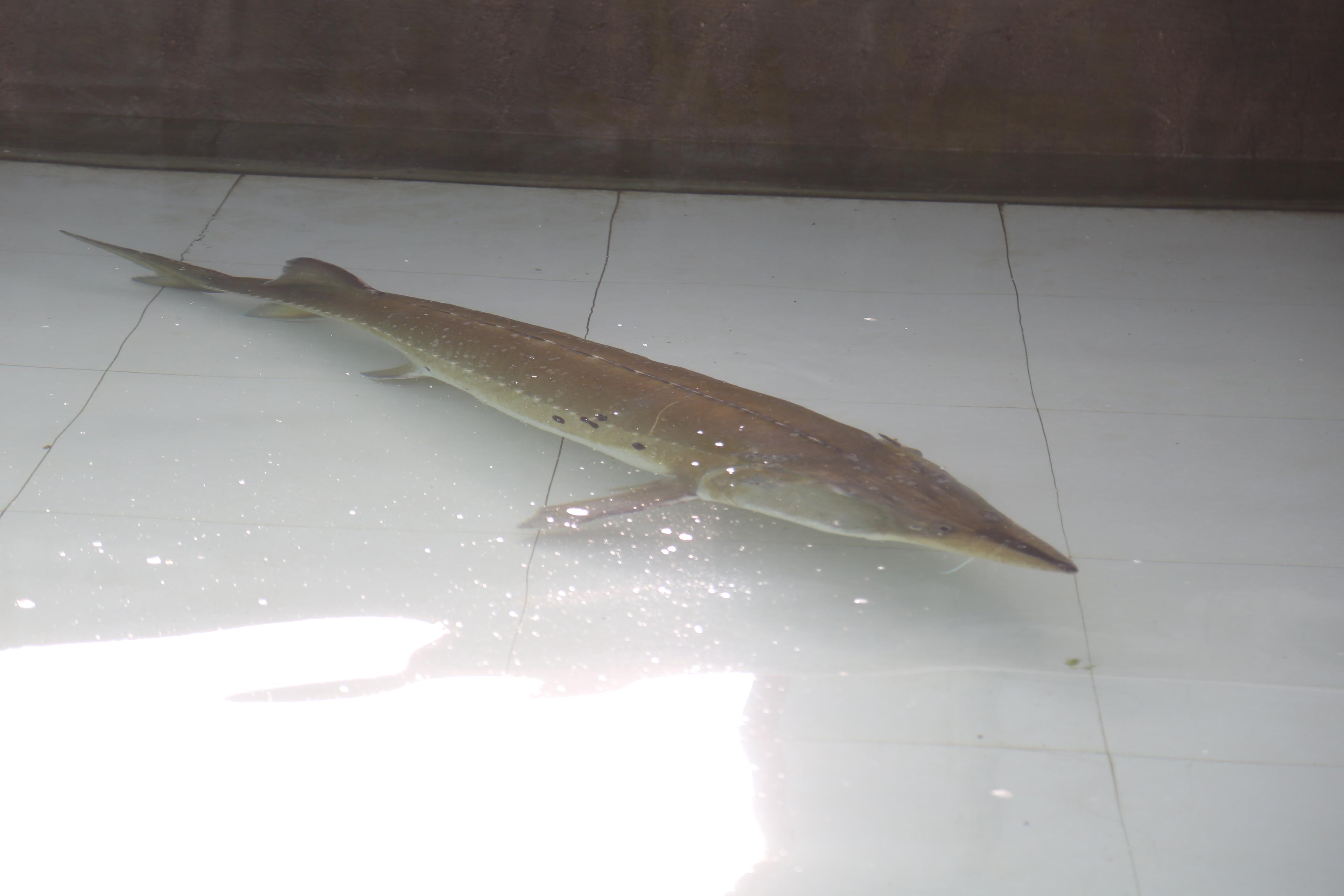 据了解,这位特殊的来客是一条野生雌性长290厘米、体重约300斤的达氏鳇,年龄在60至70岁。达氏鳇俗称鳇鱼,是淡水鱼类中体形最大的一种,也是全世界唯有黑龙江流域才有的珍贵鱼种,是白垩纪时期保存下来的古生物群之一,具有“水中熊猫”的美称,为国家二级野生保护动物。人民图片/张辉 摄