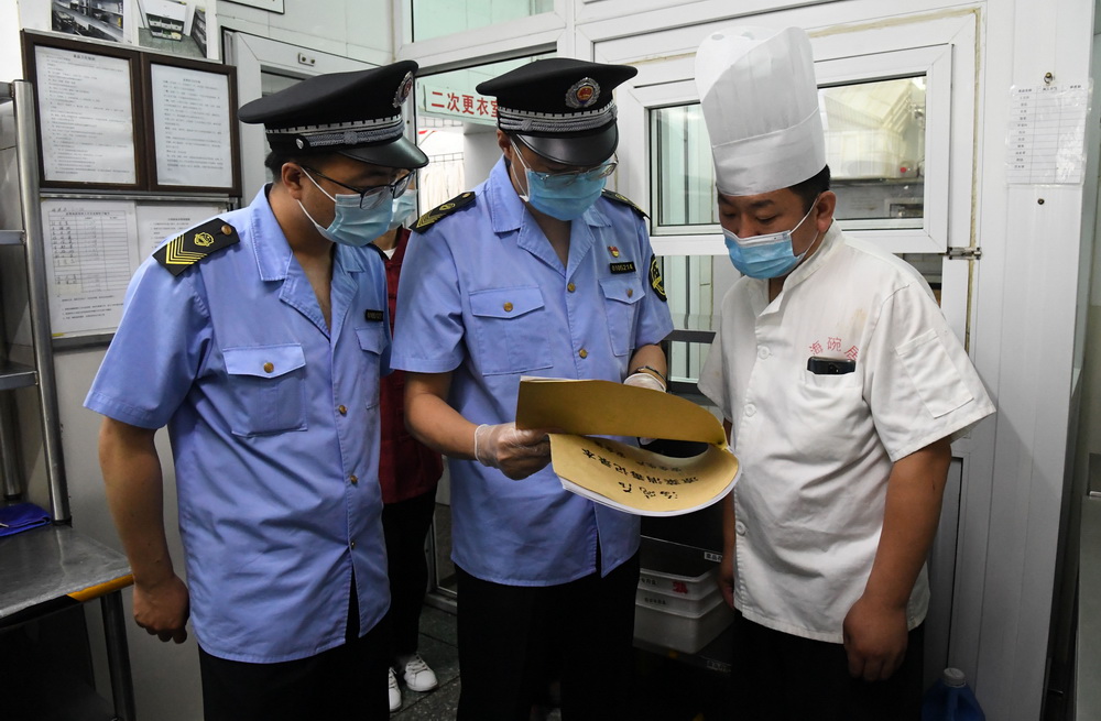 6月17日,北京市市场监督管理局和海淀区市场监督管理局的执法人员来到位于海淀区的增光鸿运市场和海碗居增光路店,对市场内蔬菜鲜肉等农产品的进货渠道、餐饮店的消毒情况进行检查,保障市民生活安全。新华社记者 任超 摄
