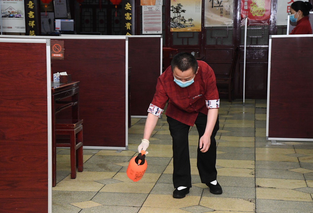 6月17日,在位于北京市海淀区的海碗居增光路店,工作人员对地面进行消毒。