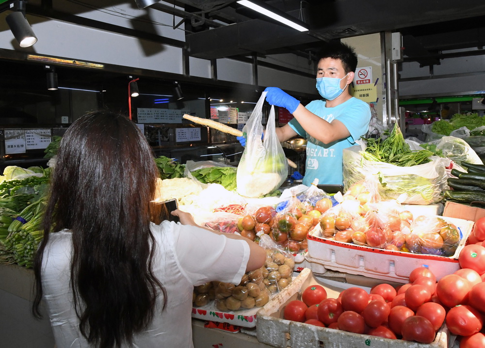 6月17日,在位于北京市海淀区的增光鸿运市场,市民(左)在购买蔬菜。