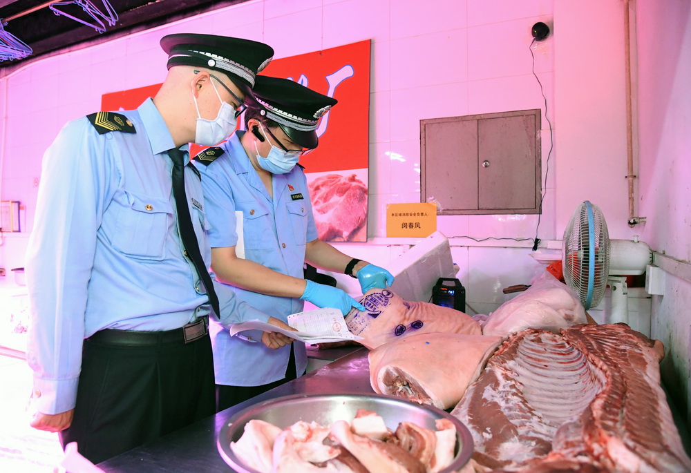 6月17日,在位于北京市海淀区的增光鸿运市场,执法人员对商户出售的鲜肉进行检查。
