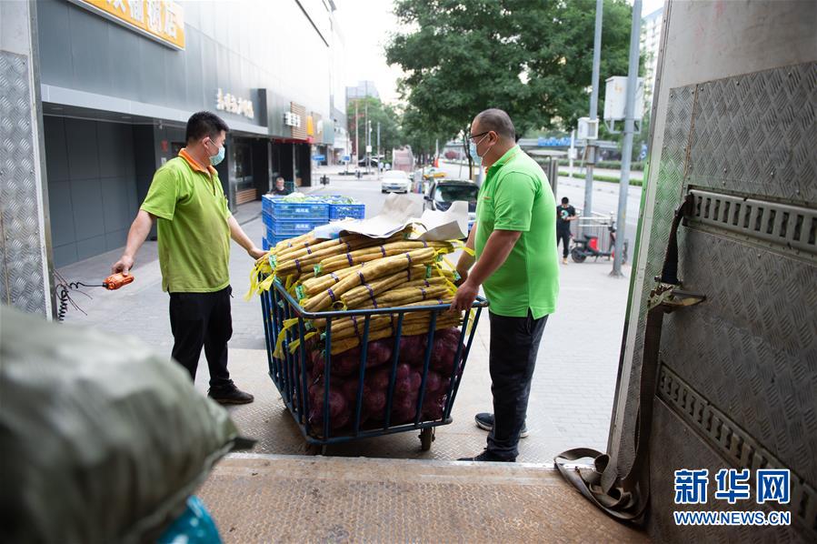 6月17日6时03分,超市发双榆树店工作人员将蔬菜搬下货车。新华社发(陈钟昊 摄)