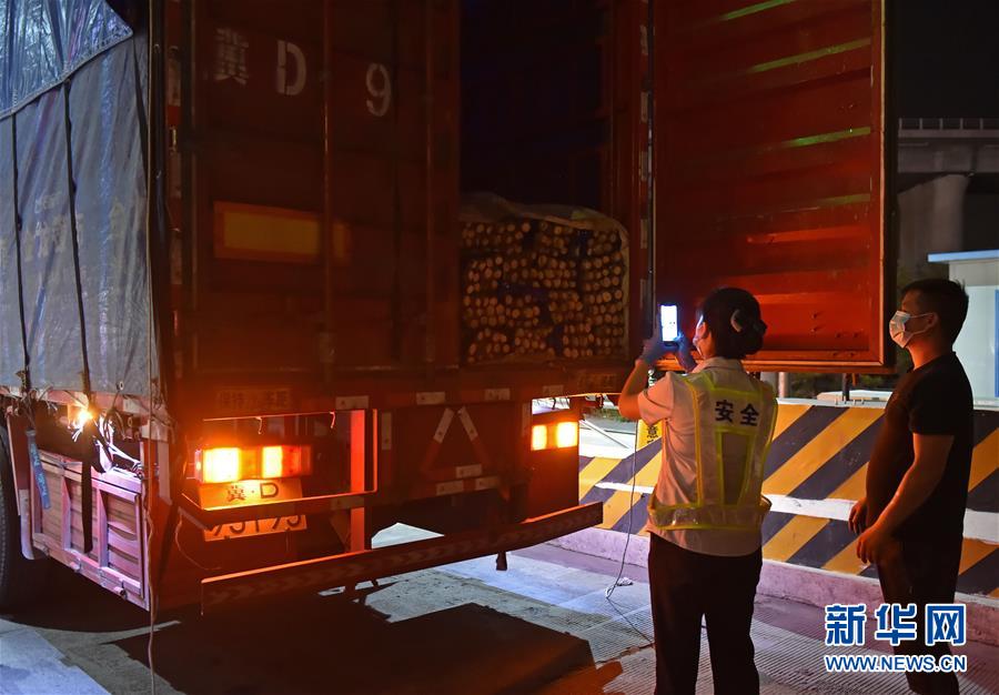 6月17日2时许,京港澳高速杜家坎收费站工作人员在检查货车里的蔬菜货物。新华社发(陈钟昊 摄)